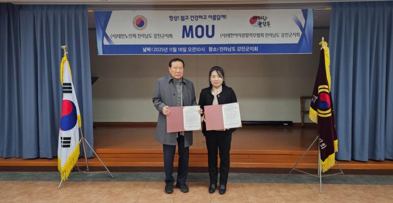 11월 18일 오전 10시 (사)대한노인회 전라남도 강진군지회와 (사)대한아리랑활력무협회는 고령사회 노인의 건강과 삶의 질 향상을 위한 상호 협력 협약을 체결했다. 이번 협약은 양 기관이 보유한 건강 분야 지식과 인적·물적 자원을 공유하며 지역 노인들...