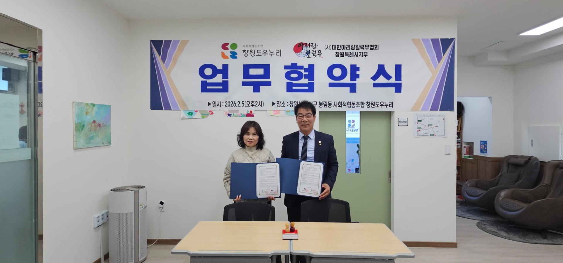 2월 5일 오후 2시, 창원시 의창구 봉림동에 위치한 사회적협동조합 창원도우누리에서 뜻깊은 협약식을 열었다. 이날은 (사)대한아리랑활력무협회 창원특례시지부와 창원도우누리 간의 공식 업무 협약을 맺었다. 지역 내 취약계층의 건강과 복지 증진을 위한 새로운 협력의 시작을 알렸다.