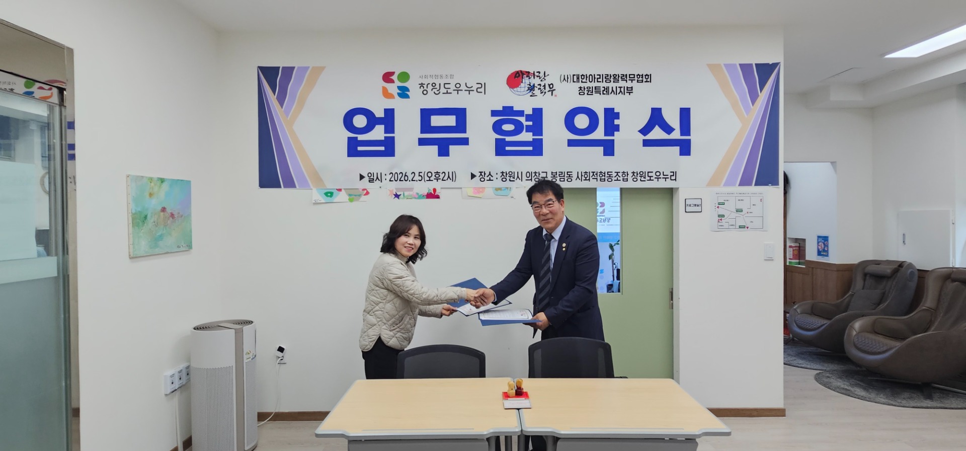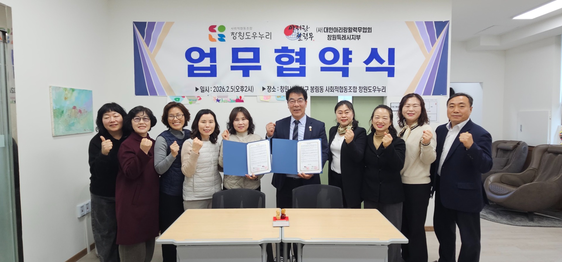 2월 5일 오후 2시, 창원시 의창구 봉림동에 위치한 사회적협동조합 창원도우누리에서 뜻깊은 협약식을 열었다. 이날은 (사)대한아리랑활력무협회 창원특례시지부와 창원도우누리 간의 공식 업무 협약을 맺었다. 지역 내 취약계층의 건강과 복지 증진을 위한 새로운 협력의 시작을 알렸다.